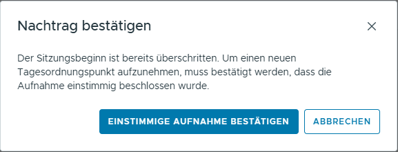TOPs, die während der Sitzung mit aufgenommen werden, müssen mit einer einstimmigen Aufnahme bestätigt werden. Es wird dieses Bestätigungsfenster angezeigt: