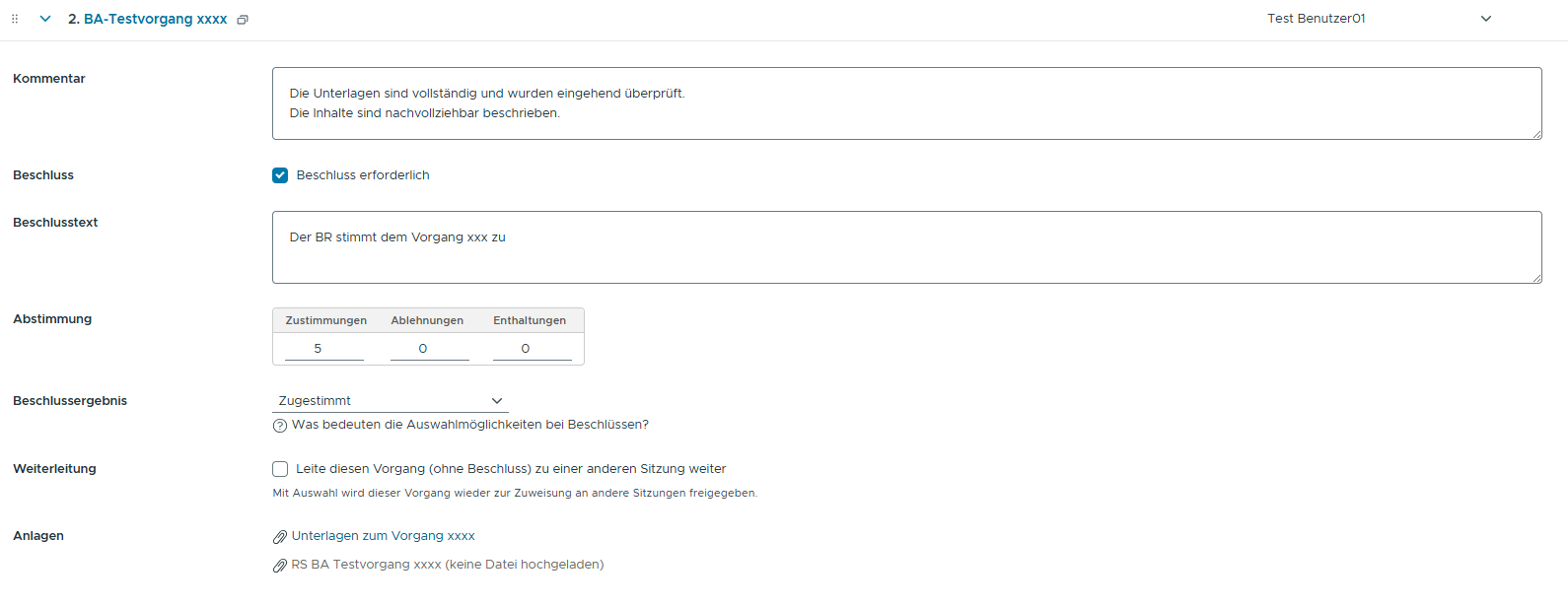 Vorgänge, die einen Beschluss erfordern, haben ergänzend zum Kommentarfeld weitere Felder für den Beschlusstext, das Abstimmungsergebnis, sowie das Beschlussergebnis.