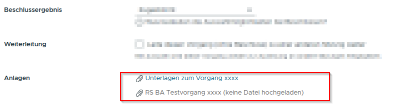Wurden dem Vorgang Anlagen hinzugefügt, so können diese auch während der Sitzung geöffnet werden. Vorhandene Anlagen werden im jeweiligen TOP als letzte Position „Anlagen" angezeigt. Sofern ein Dokument für den Eintrag hochgeladen wurde, kann der Eintrag als Link das Dokument in einem neuen Browser-Tab öffnen und damit darstellen. (Die Anzeigefunktion ist abhängig vom Endgerät und dessen Konfiguration)