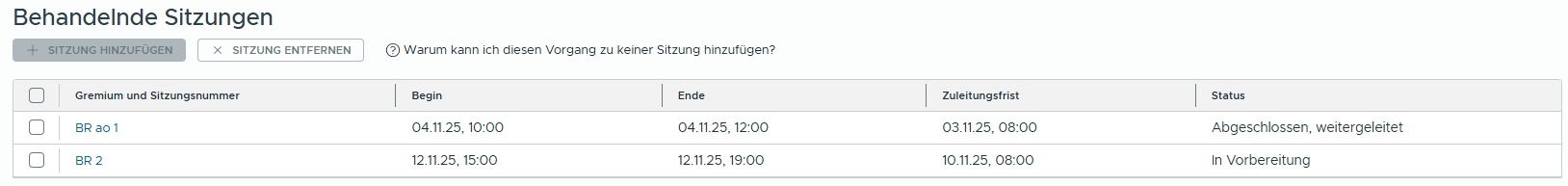In dem Fenster werden alle zukünftigen Sitzungen angezeigt, die dem Gremium/Ausschuss entsprechen, der im Vorgang festgelegt wurde. Die Zuleitungsfrist ist eine optionale Angabe, die dem Bearbeiter aber eine Hilfestellung gibt, bis wann (aufgrund ggf. interner Regelungen wie z. B. in der Geschäftsordnung des BRs) die Sitzung noch ergänzt werden kann, bzw. die Einladung erfolgt sein sollte. Eine systemtechnische Prüfung erfolgt daher für diesen Feldeintrag nicht.