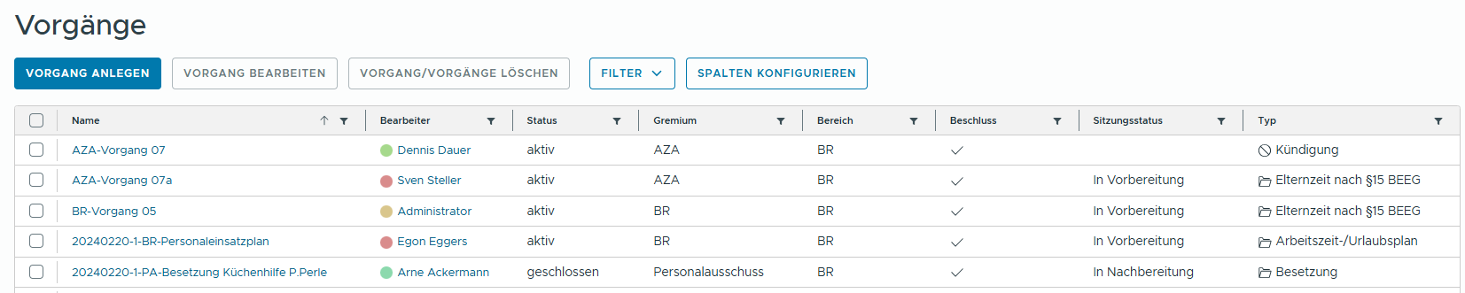 In der Tabelle werden alle Mitbestimmungsvorgänge angezeigt, auf die der angemeldete Benutzer Zugriff hat. Dies können auch Vorgänge anderer Bereiche sein, sofern der Benutzer auch in diesen berechtigt ist.