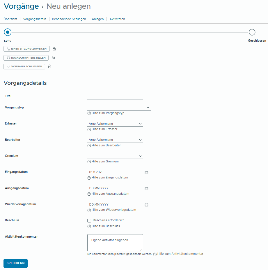 | Aktiv | Der Vorgang ist erfasst und noch in Bearbeitung. Der nächste Status hierzu ist „geschlossen", nachdem in einer Sitzung ein Beschluss gefasst wurde und der Arbeitgeber hierzu eine Rückschrift erhalten hat. |